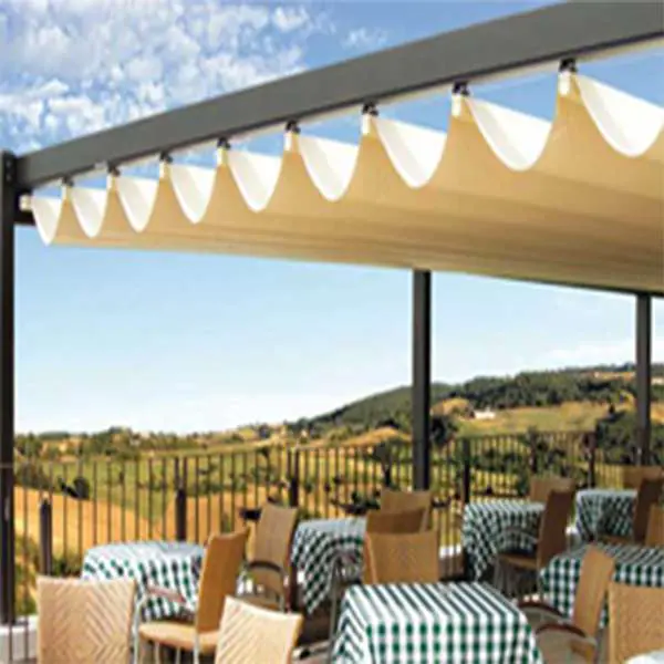 Bạn cũng có thể sử dụng mái xếp trượt có mái bạt là lưới nhựa với mục đích trang trí và tạo điểm nhấn đẹp mắt thu hút khách hàng tại một số khu vực mang tính giải trí, thư giãn như bể bơi, quán café sân vườn ngoài trời, quán ăn.…